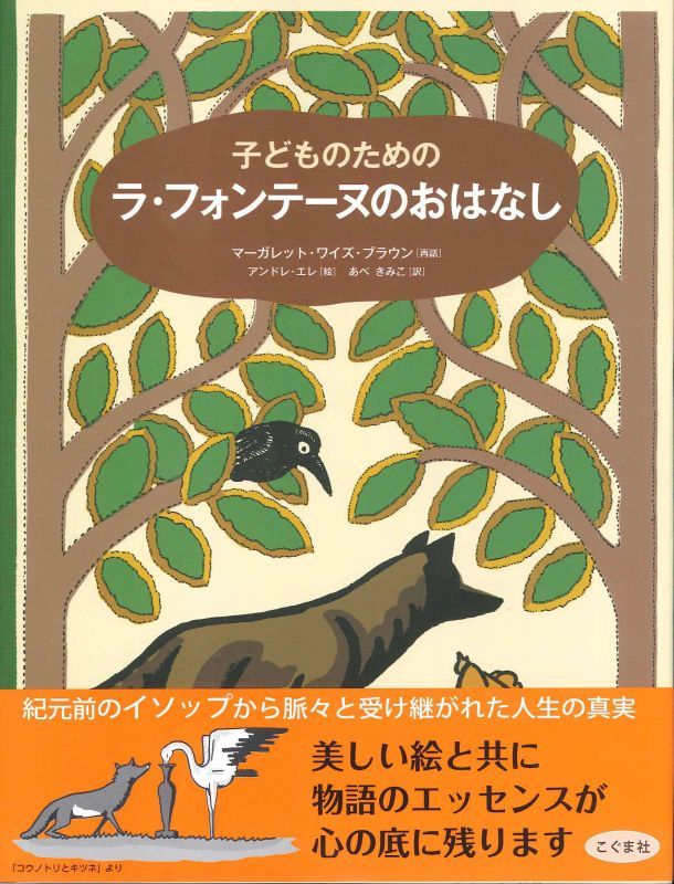 ラ・フォンテーヌは、17世紀のフランスの詩人。彼が書いた寓話(教訓的な内容を擬人化した動物などに託して語る物語)にアンドレ・エレが美しい絵をつけたお話13話が入っている絵本です。「キツネとぶどう」「町のネズミといなかのネズミ」など、イソップを源流とする素朴なお話が、鮮やかな色の絵と共に忘れられない印象を残します。