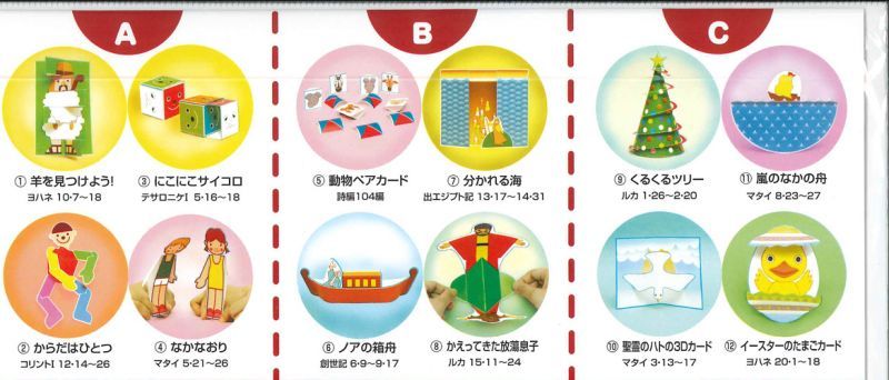聖書のお話を題材にした工作キットが各4枚ずつ1セットになっています。