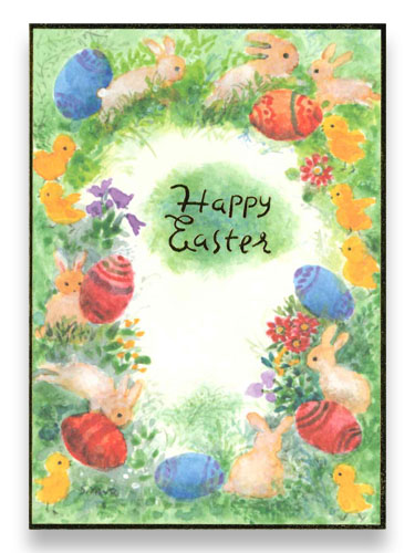 Sr.矢野滋子のうさぎとたまごの水彩画をもとにした一枚。野原に可愛らしいうさぎやひよこ、カラフルなたまごと、色とりどりの花が咲くにぎやかで春らしい色彩豊かなイラストに仕上がりました。