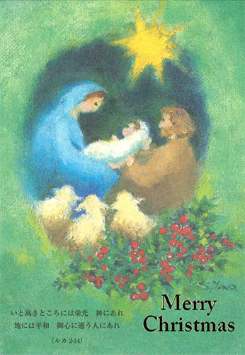 緑をバックに聖家族を描いた、Sr.矢野のクリスマスカラーのはがきです。