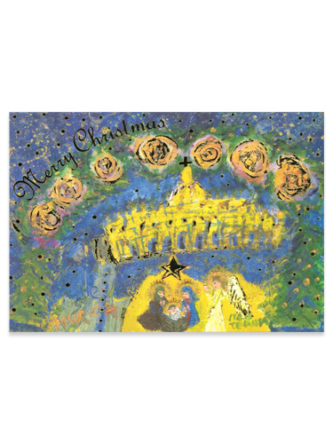 伊藤輝巳さんのイラスト『薔薇のアーチと聖家族』が描かれたクリスマスはがきです。